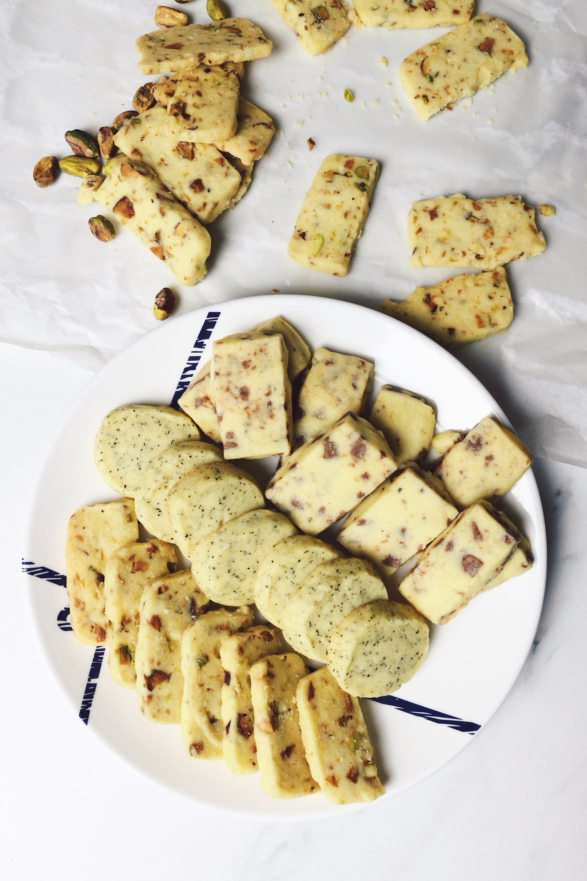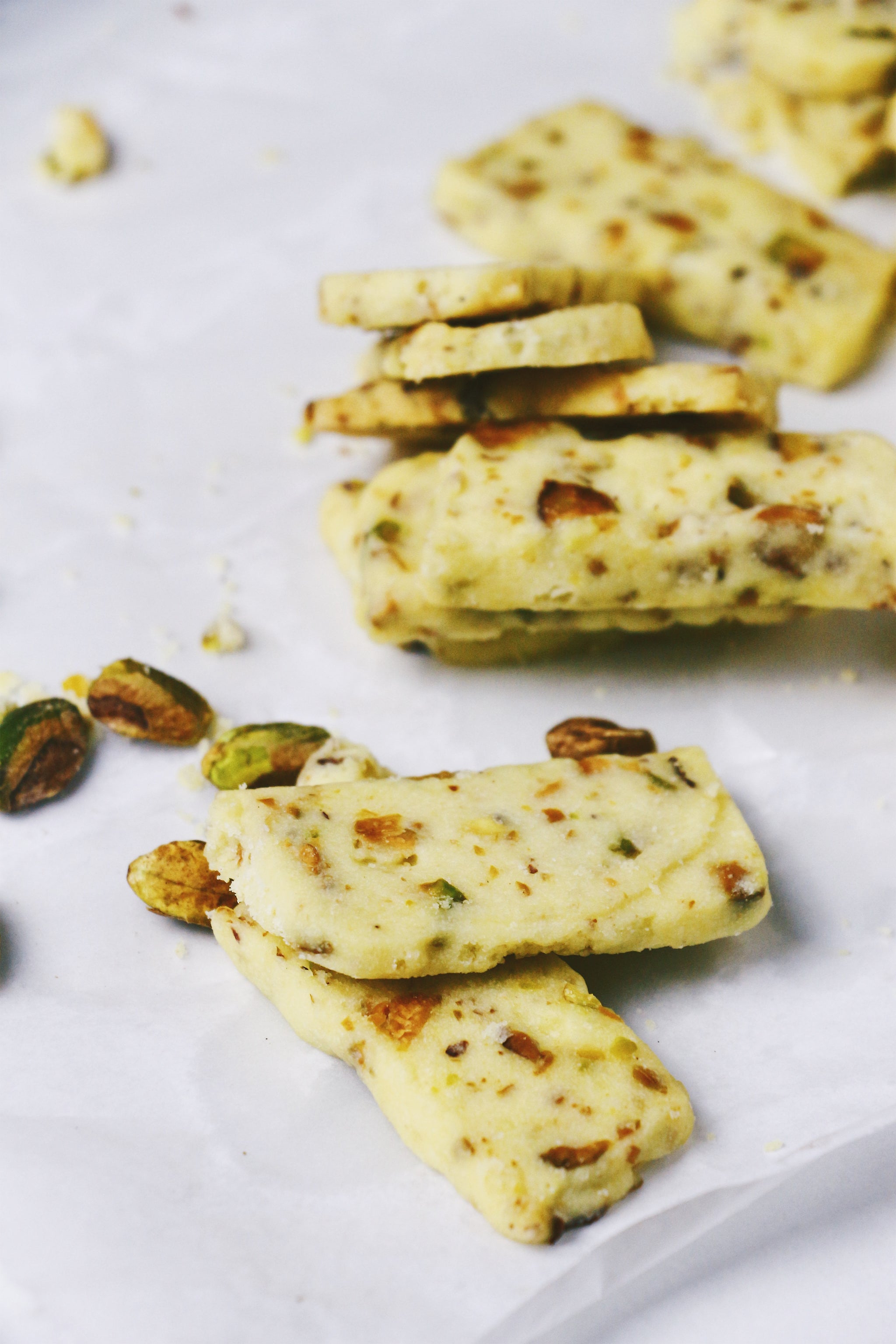 Basic, buttery shortbread cookies spruced up with chunky bites of pistachios mixed throughout the cookie. That crunchy, nutty texture really adds something else to the crumbly, buttery shortbread - perfect for a Sunday afternoon snack!