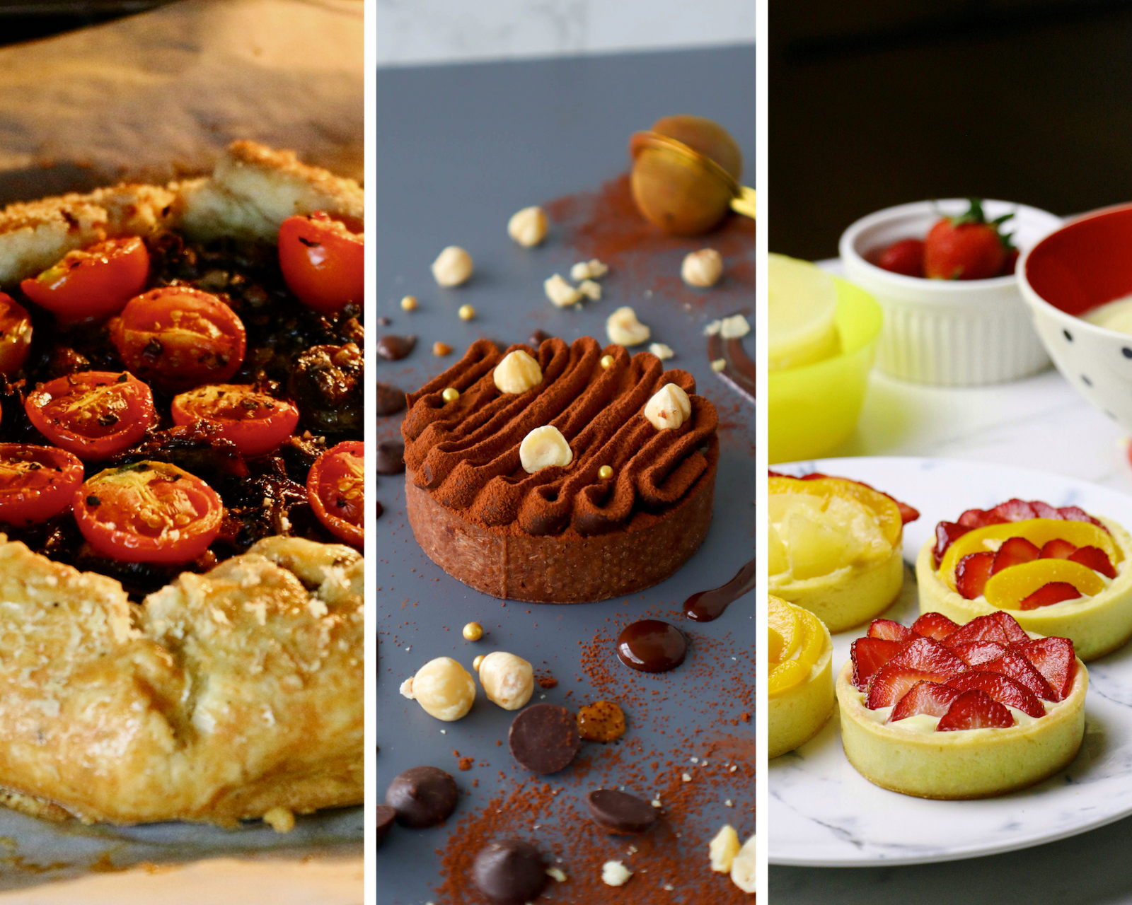 [Mushroom Margherita Galette | Hazelnut Praline Dark Chocolate Tarts | Fresh Fruit Diplomat Tarts]